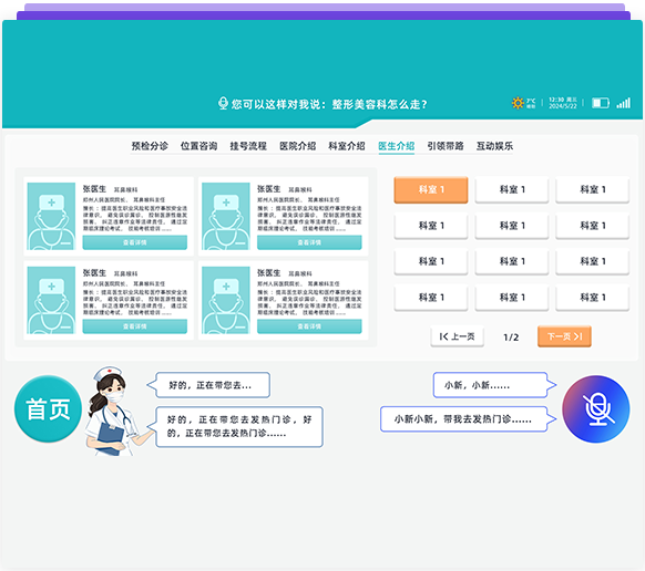 智能語音識別(關鍵字,語義雙重識別方式),導醫系統已經覆蓋了40個科室中的6000多種常見病,并且搭載了智能自診、智能導診、智能預問診、智能問答等板塊功能,可以自主回問題;用戶可以自行添加、修改知識庫?。語音對話和控制:人與機器人交流,不單純靠固定語句,可以智能回答問題——人與機器人可以隨意交流;也可語音控制機器人到達指定位置,例:我感冒了掛什么科?機器人通過專業醫療知識及大數據分析告知你準確的科室。